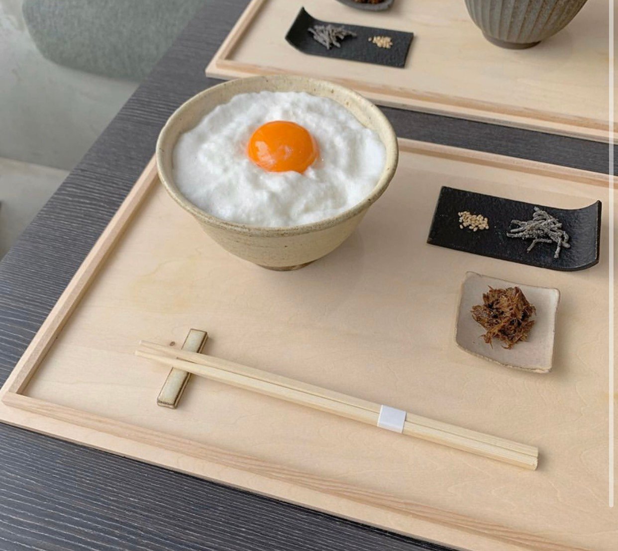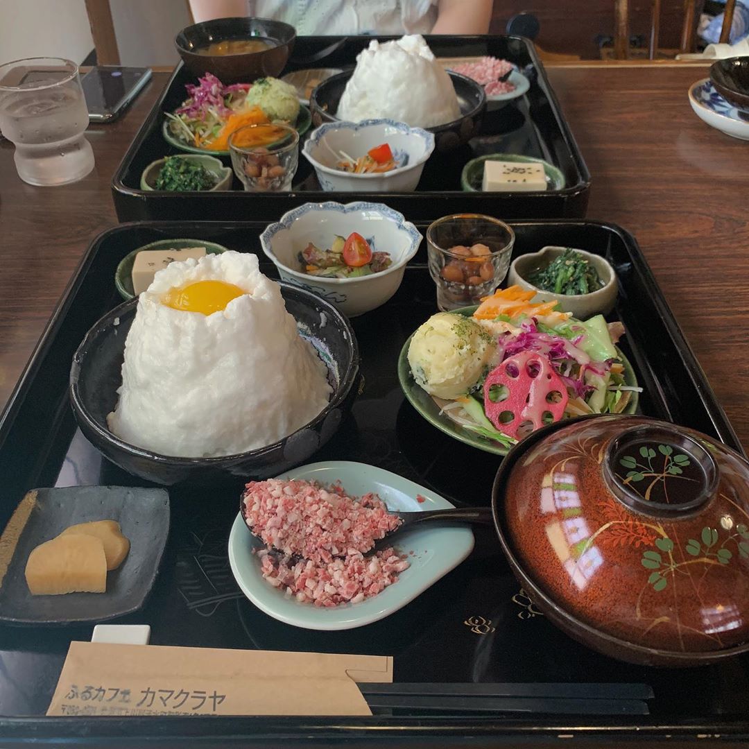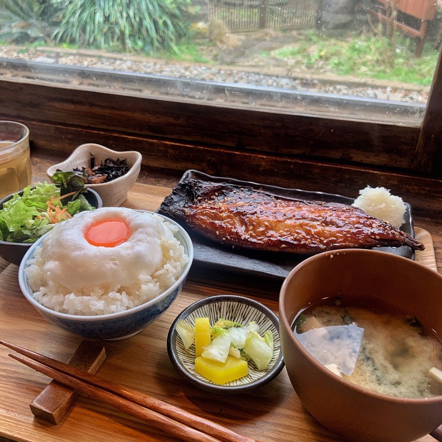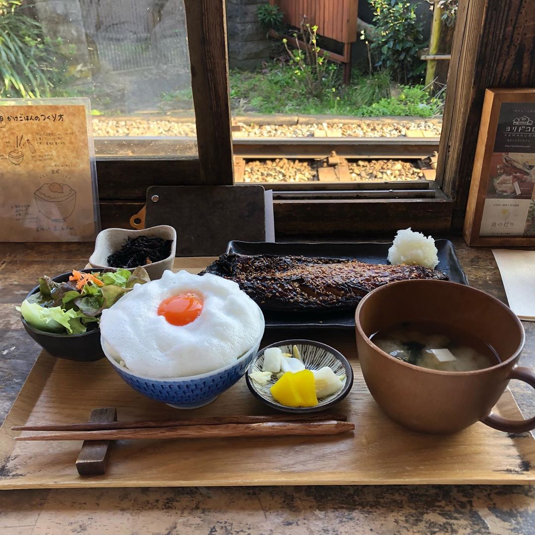 「YORIDOKORO」的生蛋拌飯僅在早餐時段(7:00~9:00)提供,因此一早就能看見許多排隊人潮等著吃上這一道熱呼呼的餐點。其雞蛋飯套餐包括熱湯、醬菜與日式烤魚,一旁還有蘿蔔泥解膩,澎湃的份量讓人不敢相信這只是早餐!不過既然來了日本就要體驗最在地的朝食,一邊享用餐點一邊望著窗外的江之電呼嘯而過吧!(完全就是日劇中的夢幻場景啊~)