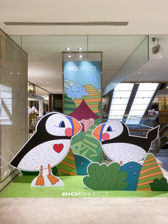 北歐最迷人的不只有自然風光,就連BIOEFFECT也無法割捨的莫過於當地的童心與藝術色彩!因此信義微風新櫃點中,也在插畫家WhimSicAL LusH的畫筆下,注入了幾個俏皮的童話元素!俗稱「Puffins」的「冰島海鸚鵡」透過繽紛的色彩、童趣手繪風格呈現於空間中,不僅吸引消費者來店拍照打卡,也成功抓住逛街人潮的腳步和目光,預計將會為品牌帶來更年輕、廣泛的新客群。