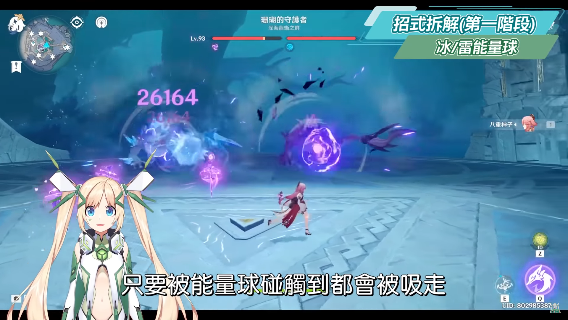 開場深海龍蜥的招式第一個一定先在場地邊緣各吐一顆能量球,只要被能量球碰觸到都會被吸走身上大量的元素能量,兩種能量球都是直線射出,冰的能量球比較容易閃避,雷的能量球具有些微的追蹤效果,在閃避時盡量不要靠得太近,不論是往左閃或是往右閃都可以很輕鬆閃過。