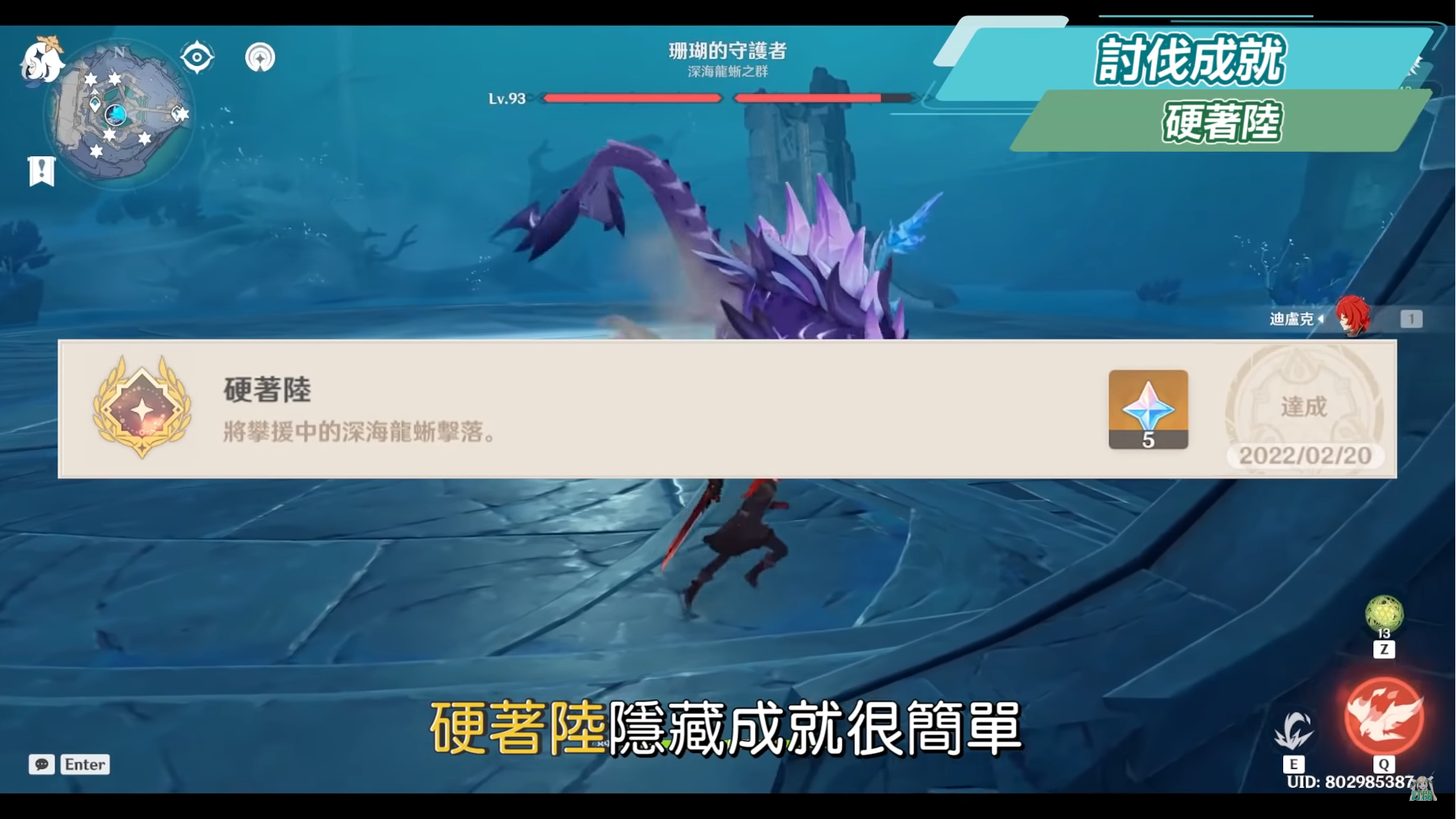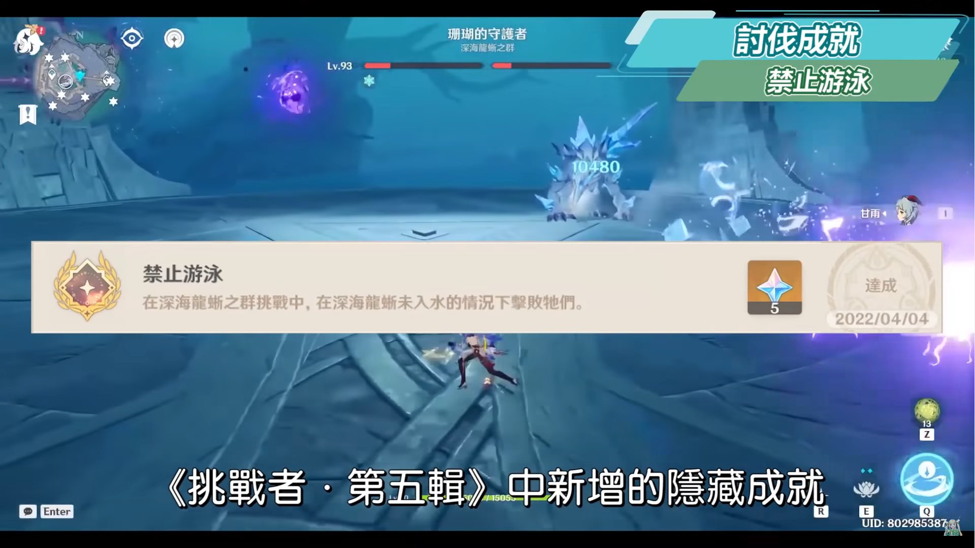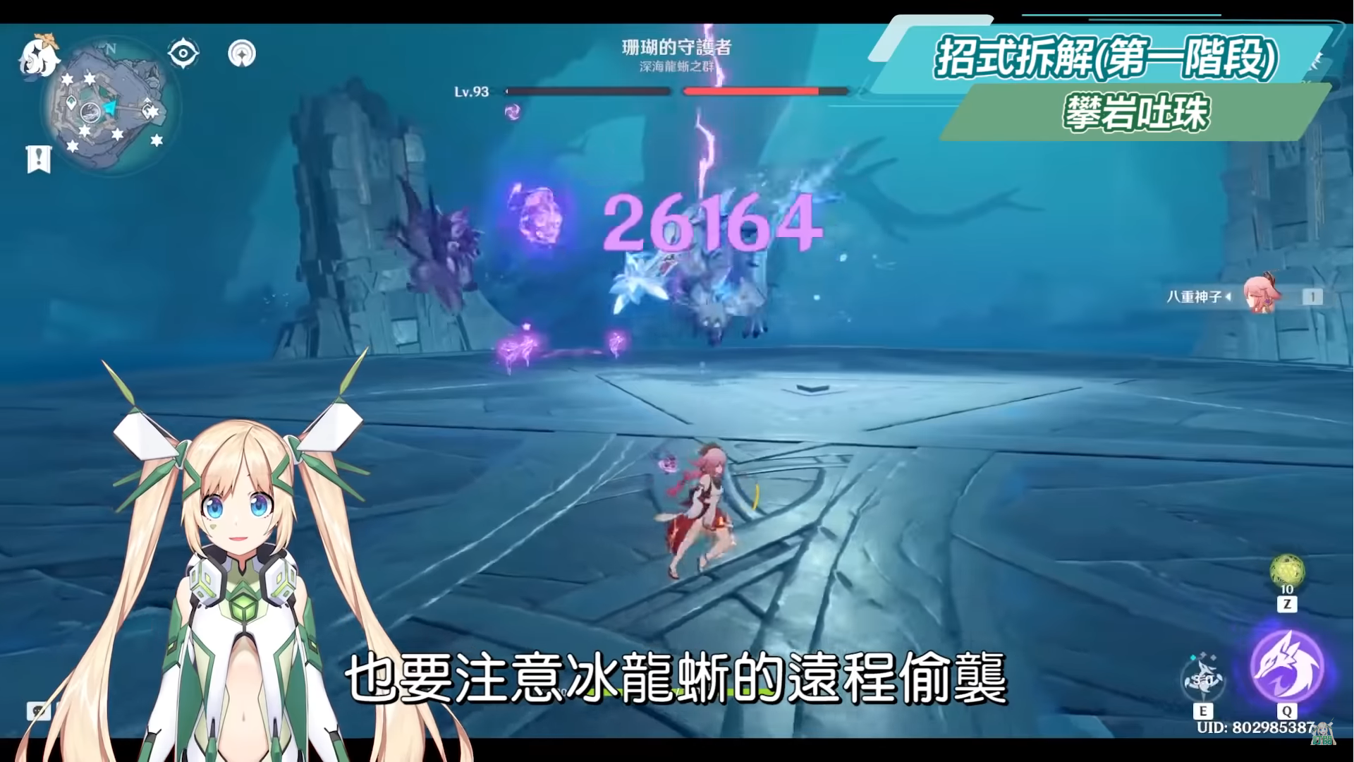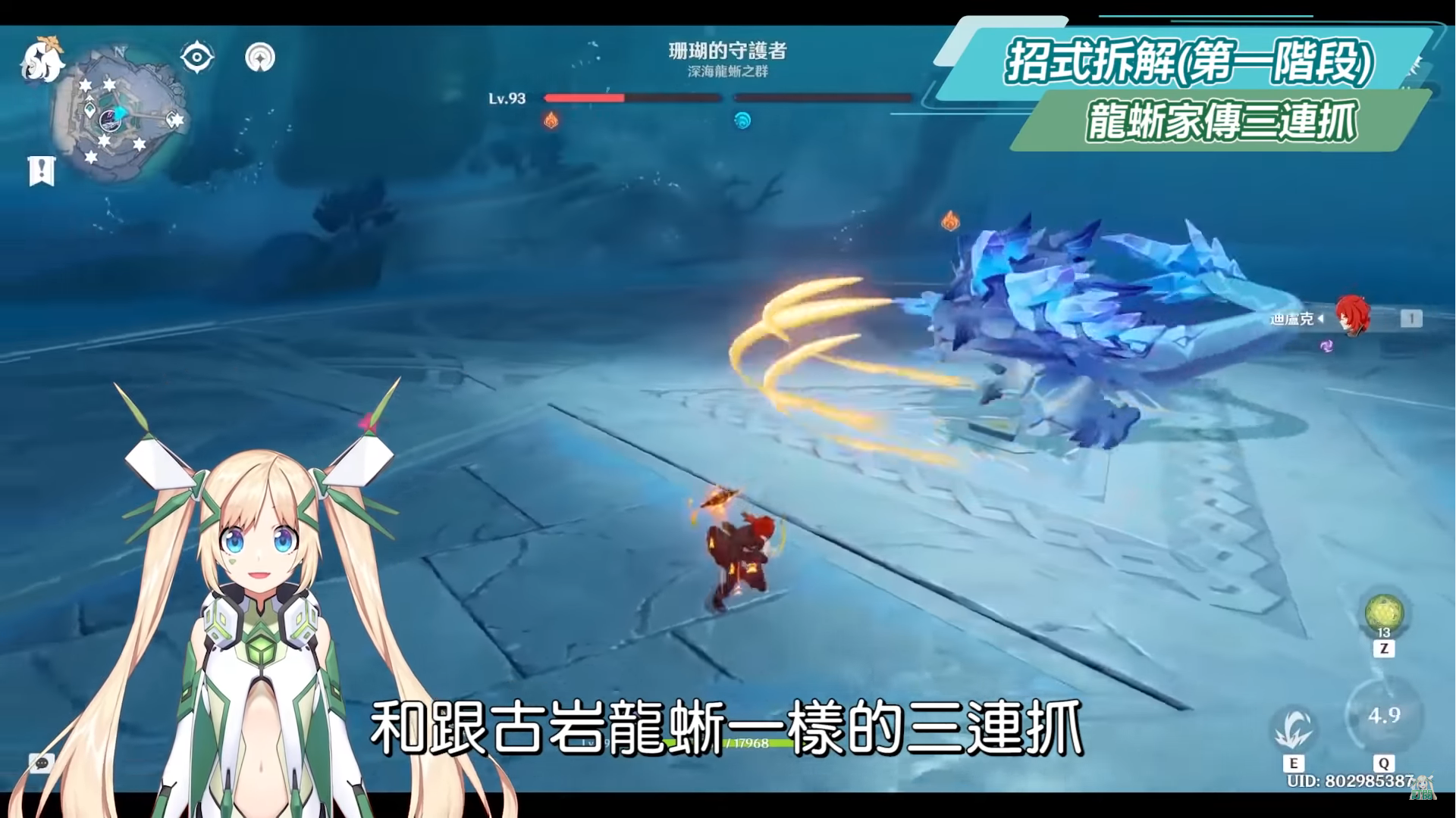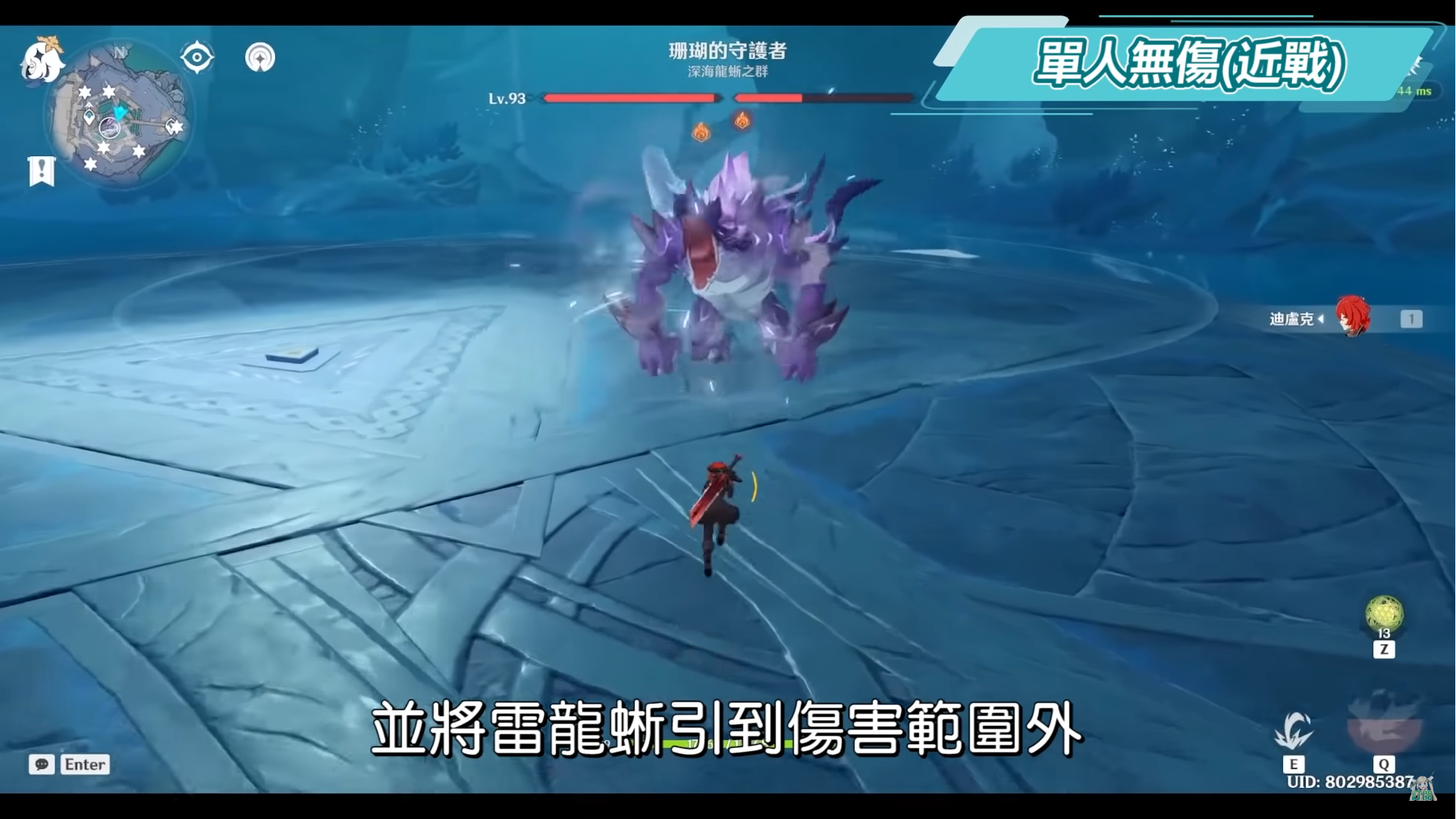 遠程角色的實戰部分這邊使用的是甘雨,只要用甘雨一個人SOLO也可以很有效率的解鎖禁止游泳的隱藏成就,招式的相關應對方式都和前面解說的一樣,而甘雨因為遠程的關係,也不太需要拆柱子,因此只要控制好兩隻龍蜥的血量就可以一起無傷帶走。
