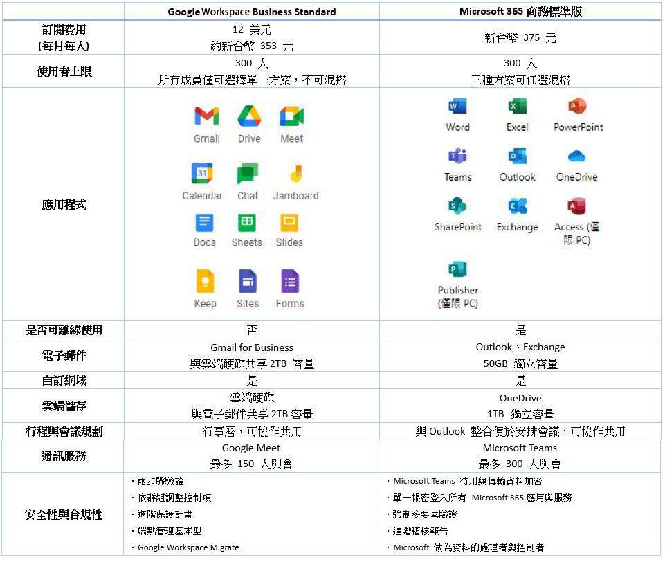100 人以下中小型企業:Google Workspace Business Standard vs. Microsoft 365 商務標準版