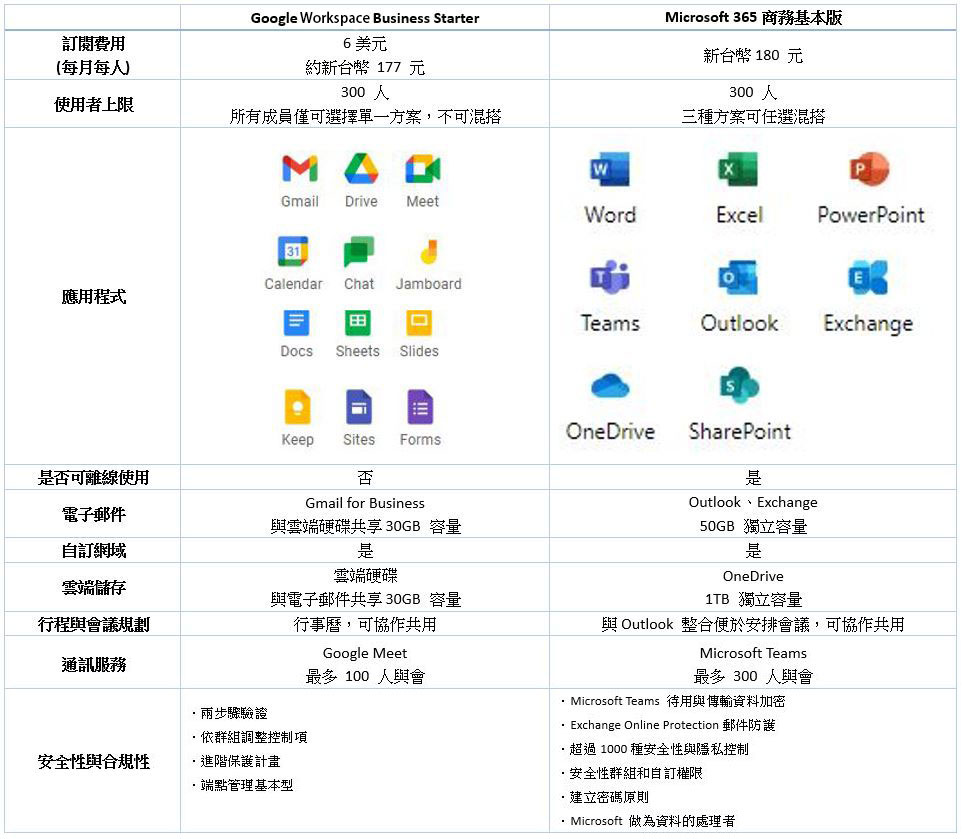 由於 Google 將會把免費用戶轉換為最基礎的 Google Workspace Business Starter,下面筆者將它與 Microsoft 365 商務基本版這兩項同級訂閱產品列表,清楚比較兩者之間的差異:
