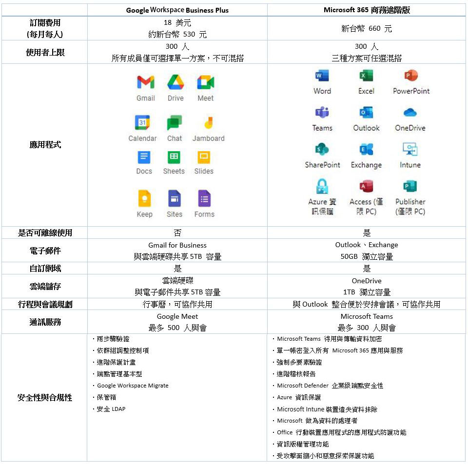 同樣地,我們把 Microsoft 365 商務進階版與同級的 Google Workspace Business Plus 相互比較一下: