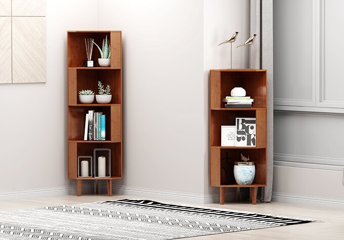 與旋轉書櫃相似地都是能夠善用空間的書櫃款式,不同的是角落書櫃在視覺上更能夠融合在居家空間中,雖然放置書本的量可能不及旋轉書櫃,但是角落書櫃更能夠兼具空間整體的美感,放置在角落也較不易碰撞,除了書本之外也可以適當地放置一些裝飾品。