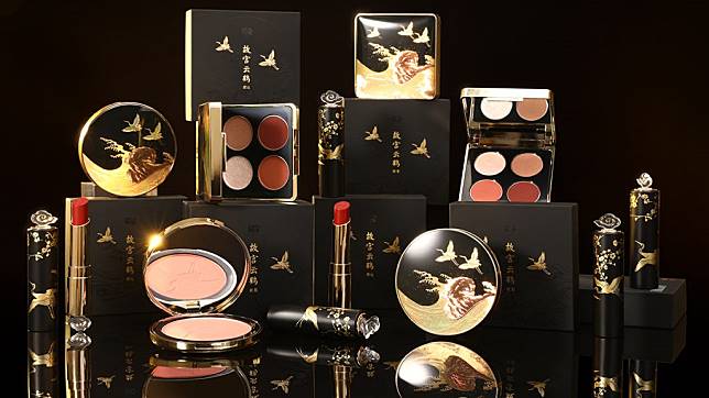 該系列化妝品的包裝以故宮文物「紅漆邊架緞地繡山水松鶴圍屏」為發想,以立體浮雕的燙金工法,將梅花及仙鶴畫滿眼影、腮紅與口紅的外包裝上。在清代,仙鶴是一品大臣與受誥封的命婦用的,是皇室以外的女子能夠使用的最高等級紋樣。這次故宮將之入題於彩妝品中,光眼影便有四色,口紅三色,腮紅一色。