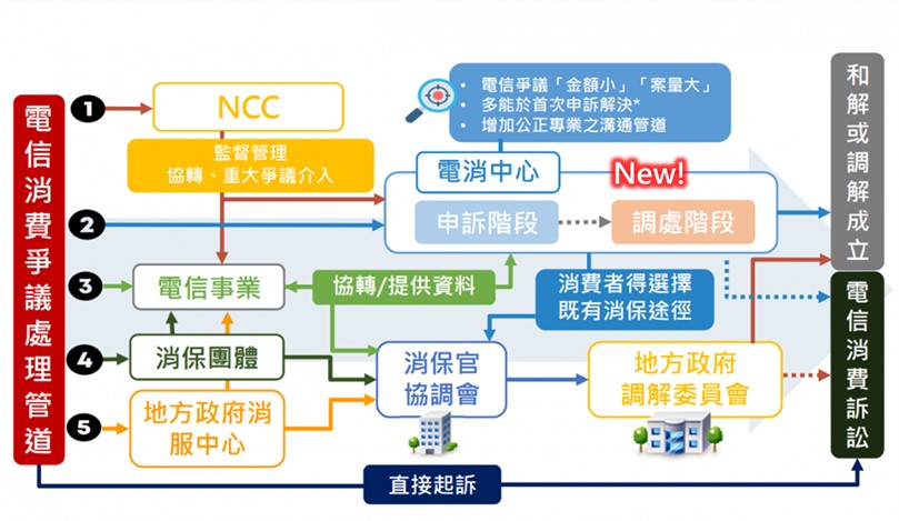 現行處理消費者電信及固網消費爭議管道有四,包含向NCC申訴、向電信業者申訴、向消保團體申訴及向地方政府消服中心申訴等四種申訴管道,未來將新增第五個管道~透過「電消中心」來快速受理並仲裁向NCC或電信業者的電信申訴案件。