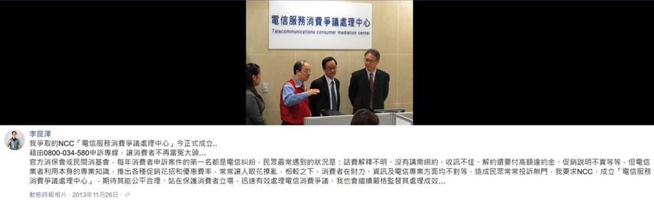不過,比較弔詭的是,「電信服務消費爭議處理中心」早在2013年就由李昆澤立法委員所爭取並已在NCC成立專責單位來受理電信消費爭議申訴,目前民眾就可撥打0800034580 (0800您申訴我幫您)進行相關申訴。