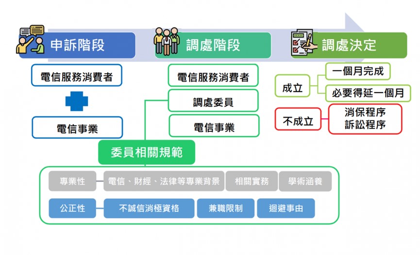NCC表示,電消中心將聘有具備相關專業學養或實務經驗之公正人士擔任調處委員,期由該中心協助下使民眾與電信業者間以簡易迅速非訟之方式,於雙方自主、自決及合意的方式解決消費爭議。
