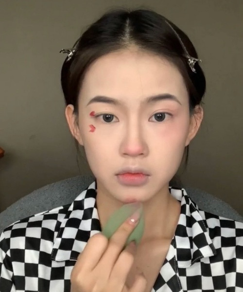 接著,再拿出沾濕的美妝蛋拍開,使液態腮紅自然融合於底妝,記得手法要輕拍,沿著V字線條拍開,不要超過太多範圍,超自然的腮紅妝就完成啦~