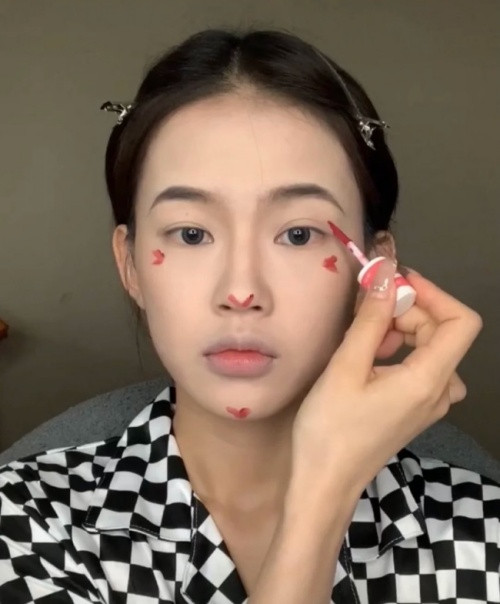 接下來,就可以進入4V腮紅重點啦~首先準備一個液態腮紅,在眼下蘋果肌兩側畫兩個V,鼻頭和下巴也各畫一個V,最後在兩邊的上眼尾各畫一撇。