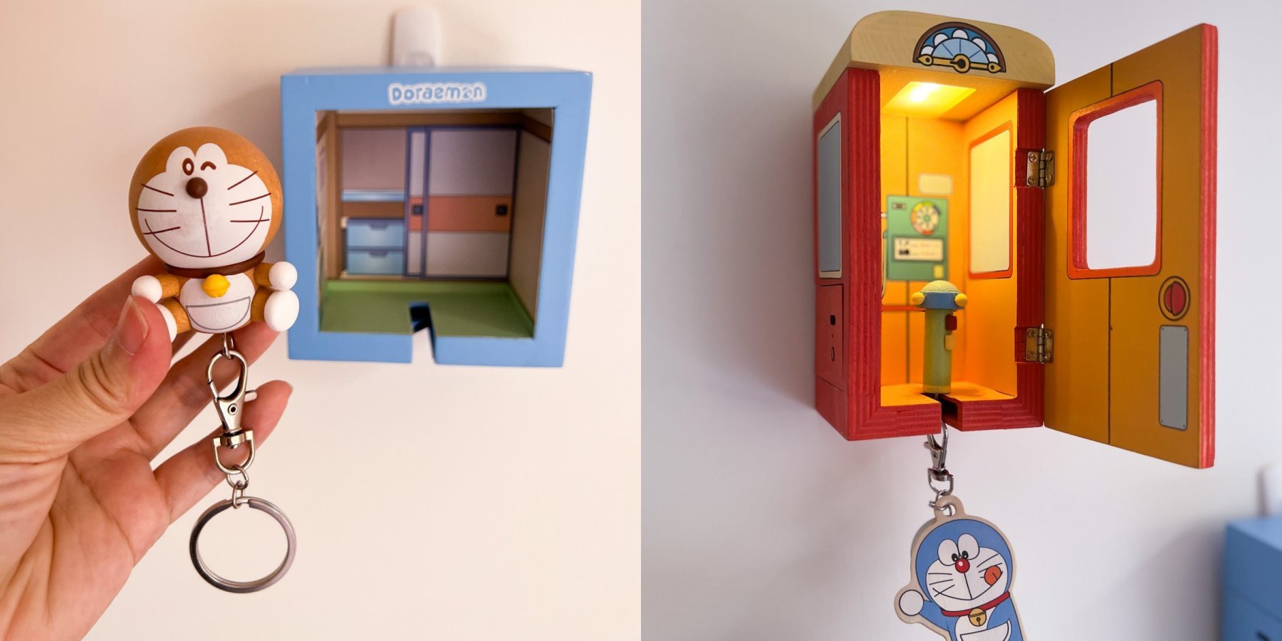 登登登~如果電話亭!這是可以搭配鑰匙圈一起使用的「發光鑰匙座」,鑰匙座底下有裝LED感應燈功能,只要放入鑰匙圈就會亮燈啦,有如果電話亭、哆啦A夢睡覺的房間兩款,妞妞們都可以掛在玄關,讓哆啦A夢迎接你回家!