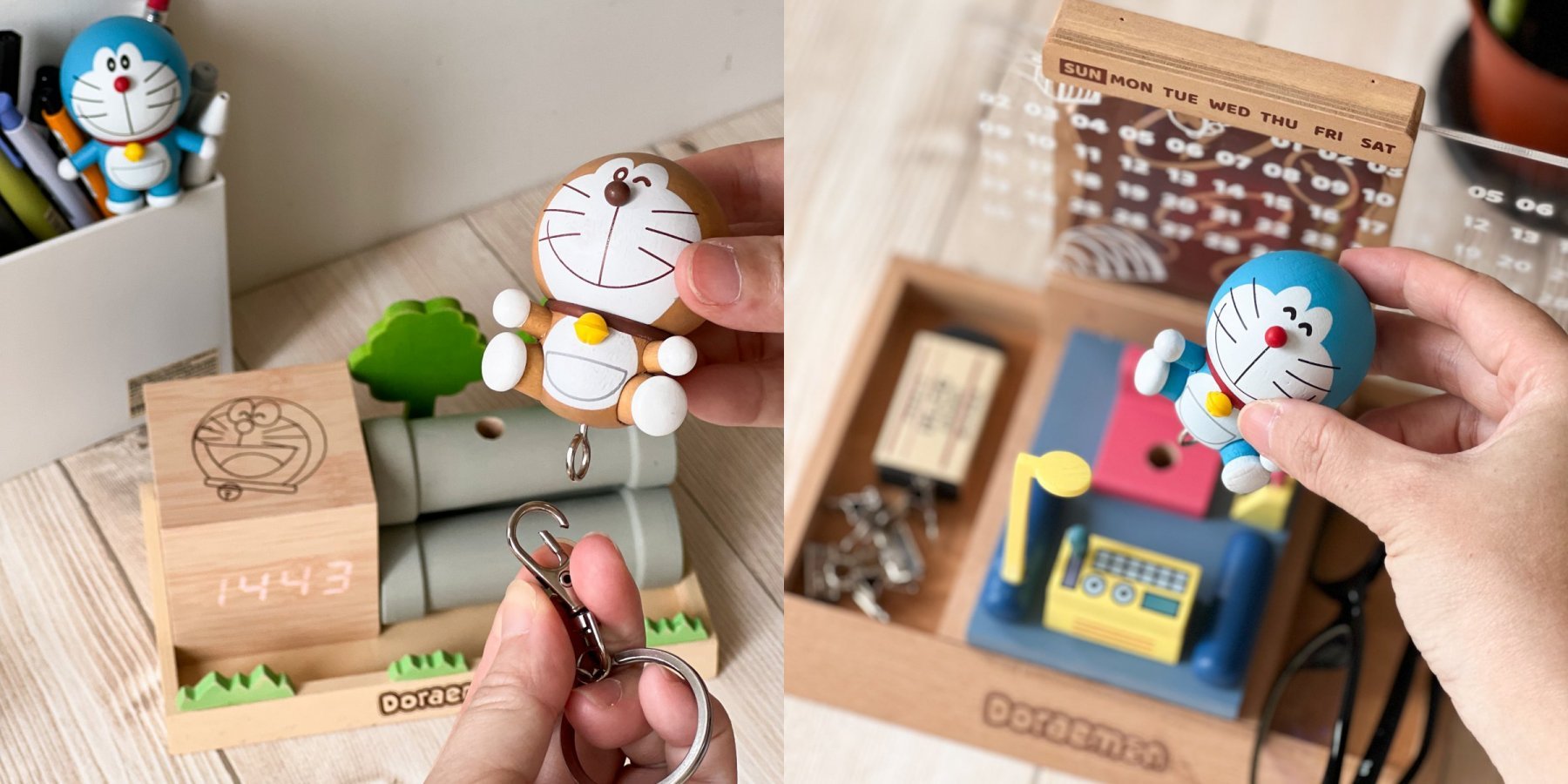 而萬用電子鐘以及時光機造型萬年曆都能搭配立體公仔鑰匙圈,把哆啦A夢插進上方小洞內,讓他可以融入場景內呢!這一次的周邊真的都做得好用心呀~