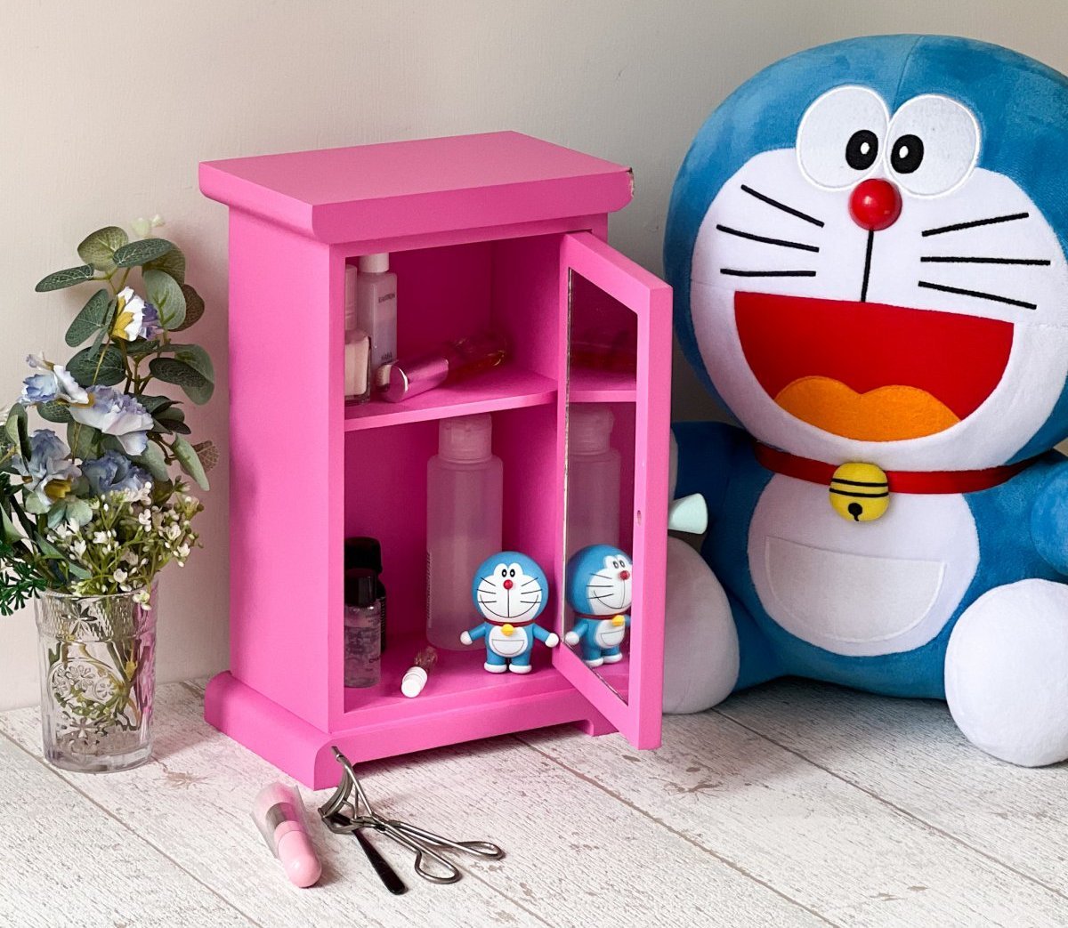 家居的部分有任意門造型的「桌上收納櫃」,門內有附化妝鏡,雙層設計收納小物超方便;以及哆啦A夢大臉設計的「體重計」,上頭有重量、室內溫度以及電量標示,造型吸睛又實用。