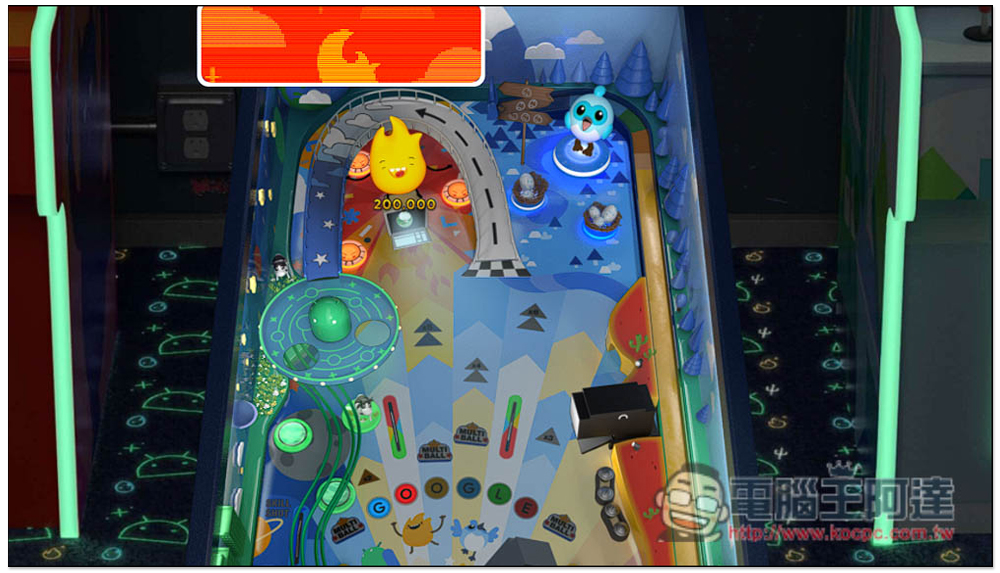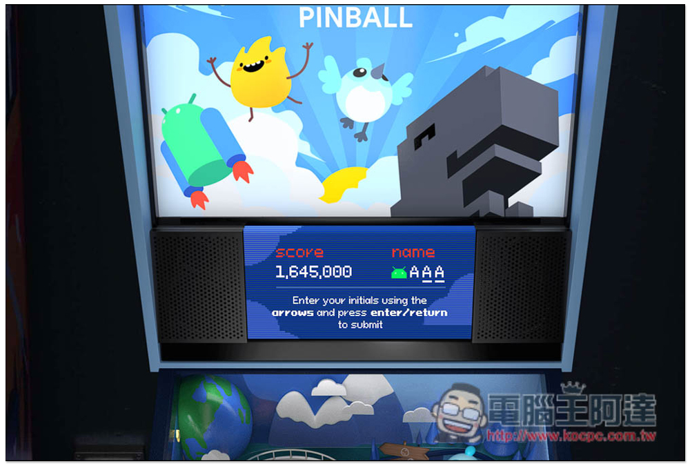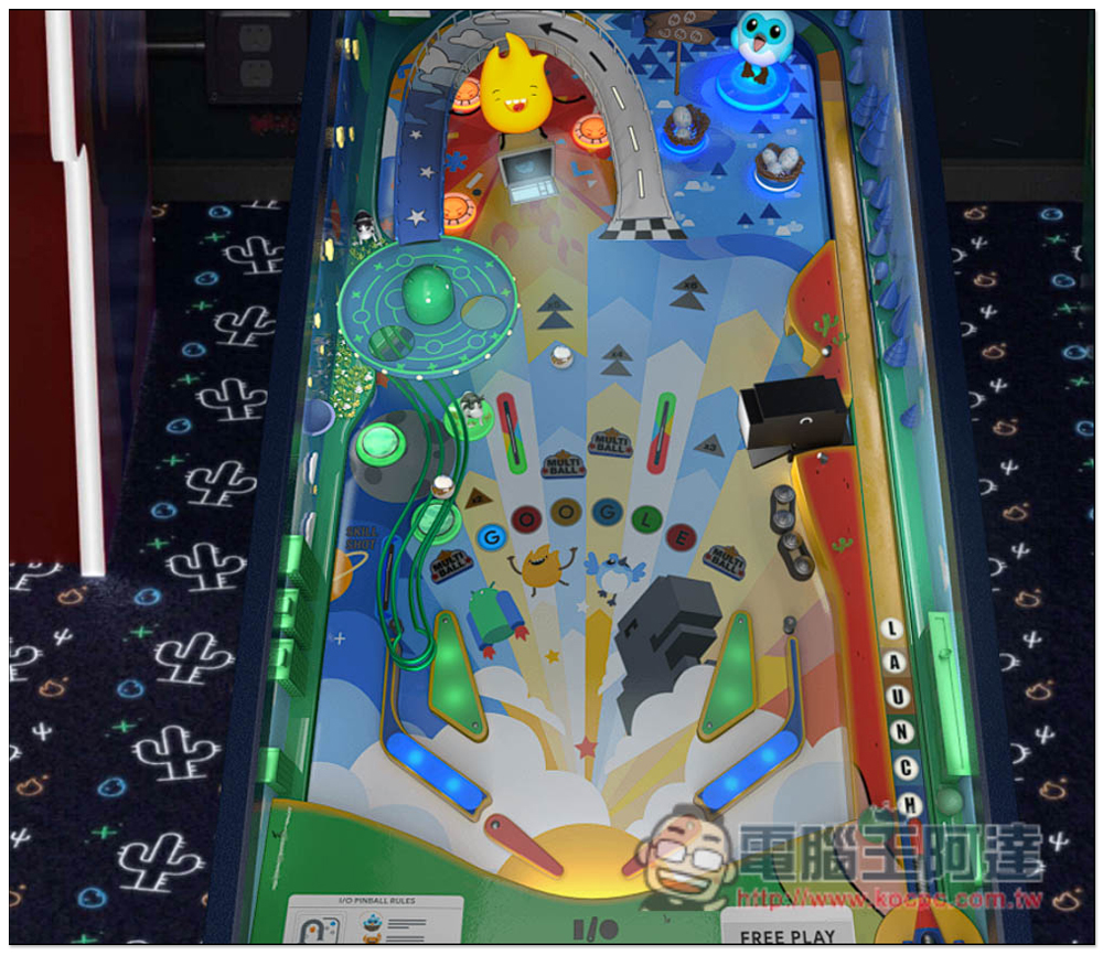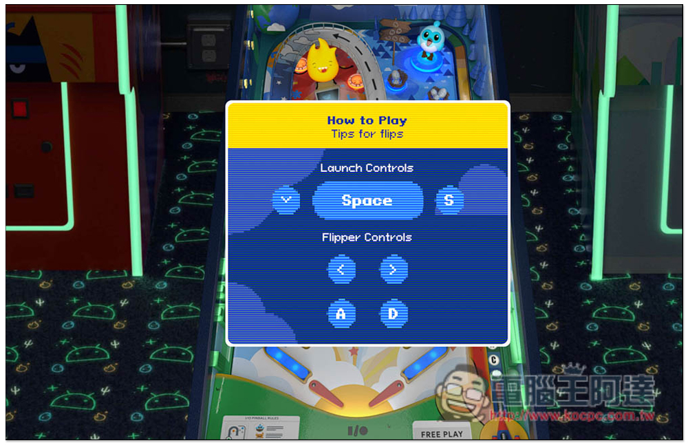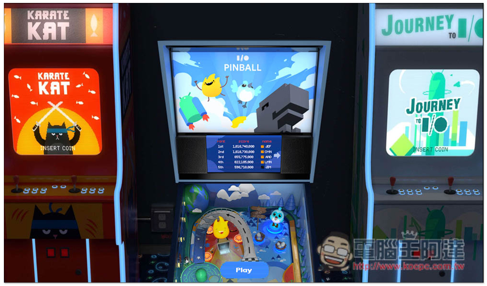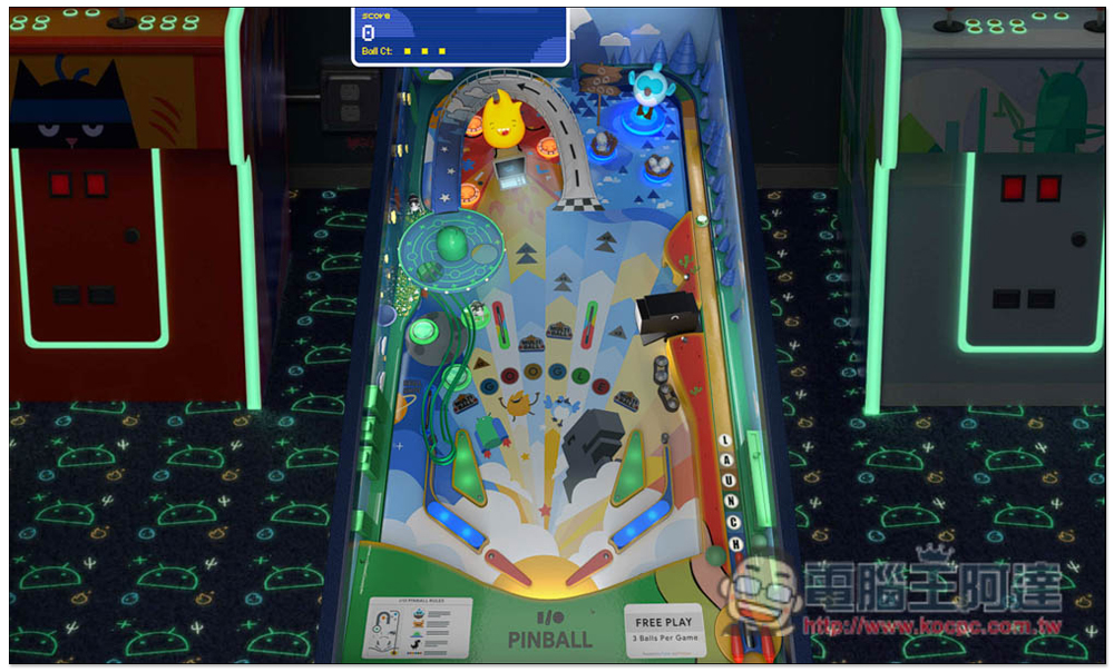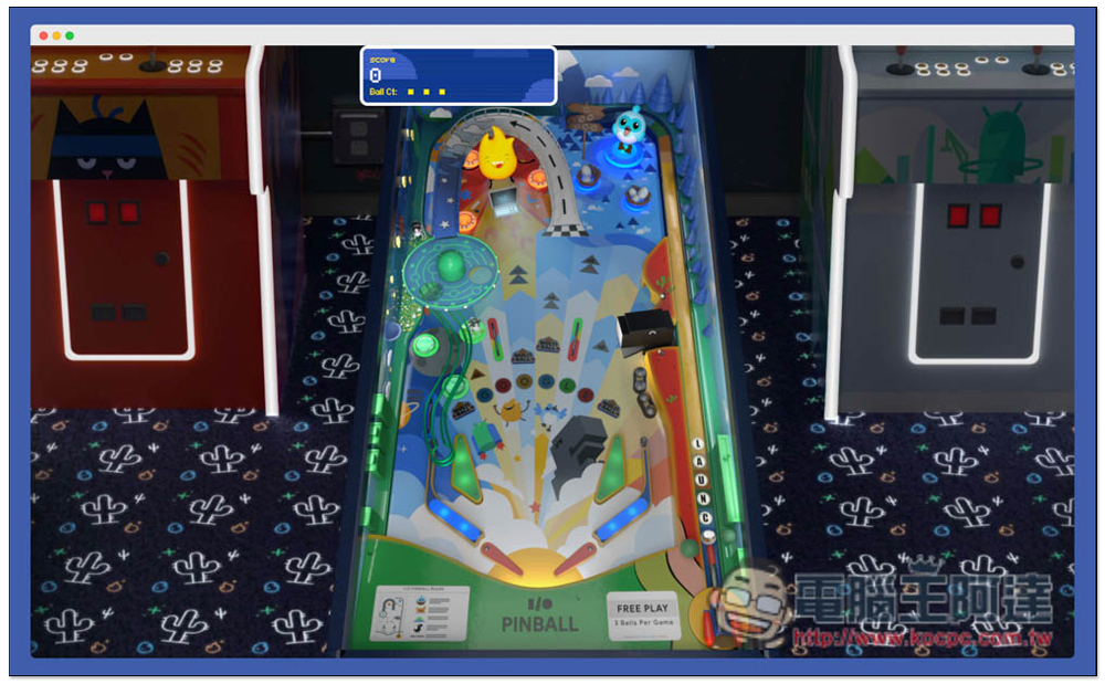 Google 立體彈珠台遊戲網頁版的設計,很像是讓人進到電子遊戲場一樣,彈珠台的左右兩側還有其他機台,還寫的 INSERT COIN 投幣的字樣,只可惜沒辦法真的切換玩。按下方 Play 開始立體彈珠台遊戲: