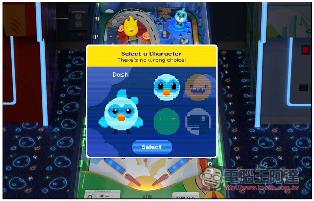 接著選擇你喜歡的角色,目前共有四種,分別維 Dash、Sparky、Android 以及 Dino,Dino 就是大家很熟悉的小恐龍,陪伴許多人斷線時光,選好後就按 Select: