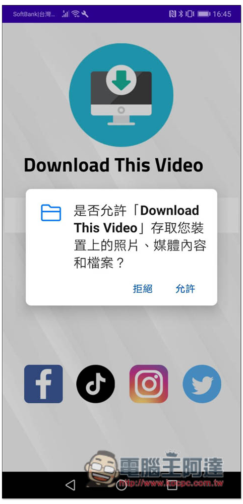 首次打開 Download This Video App,會要求取得存取裝置上的照片、媒體內容和檔案權限,記得允許,這樣才能下載到手機裡: