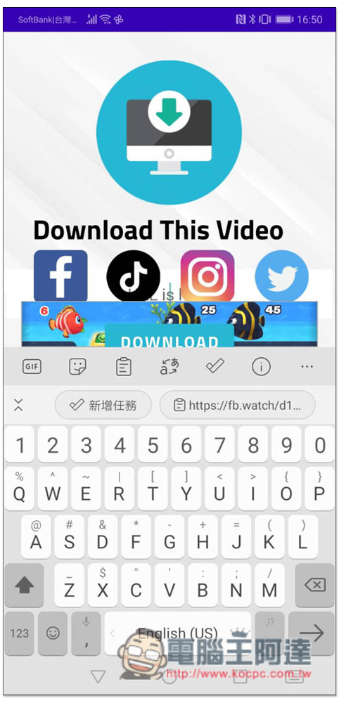 當然,也不是沒缺點,不知道是我的手機螢幕解析度沒有優化好,還是其他原因,當我貼上影片網址之後,鍵盤會將下半部的畫面往上推,導致 URL 欄位與 Download 被覆蓋,看不到 Download 功能,必須將鍵盤縮小才能使用: