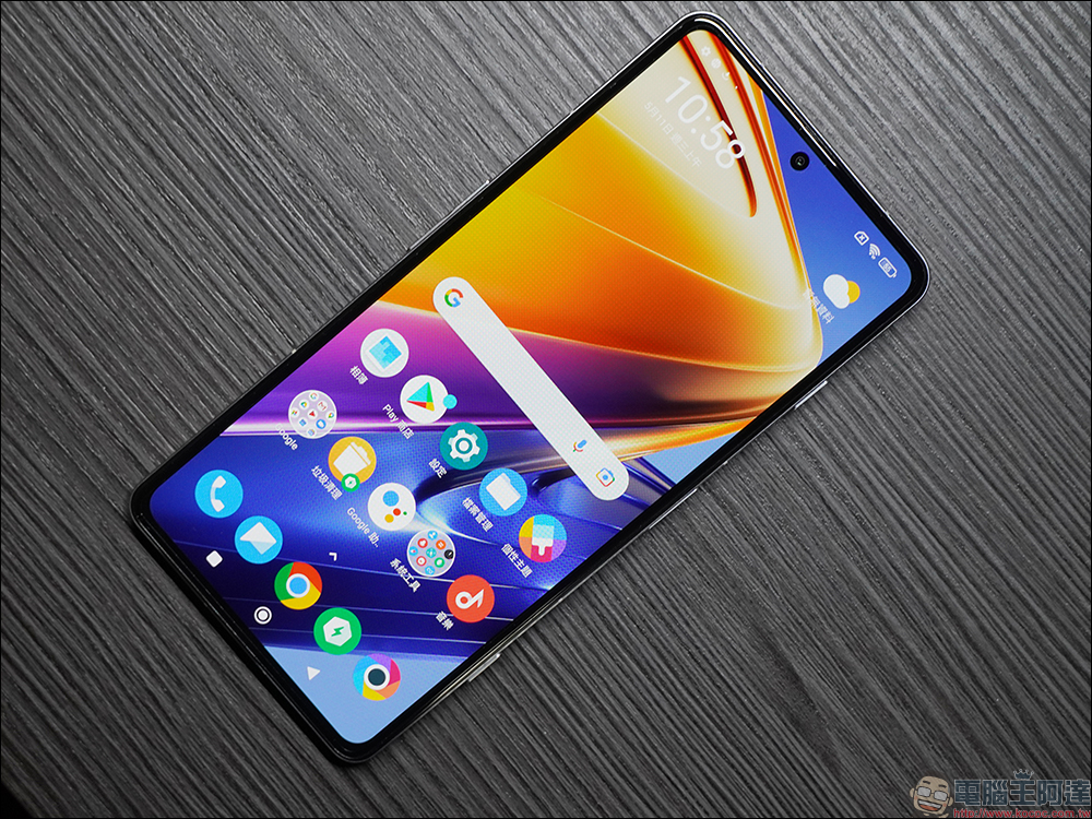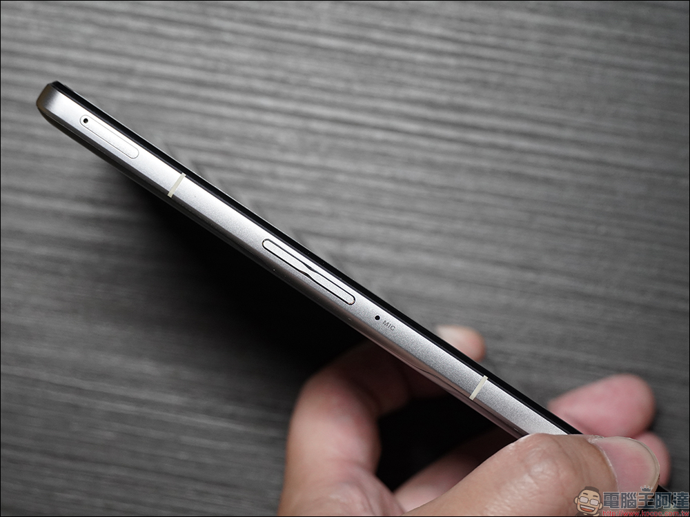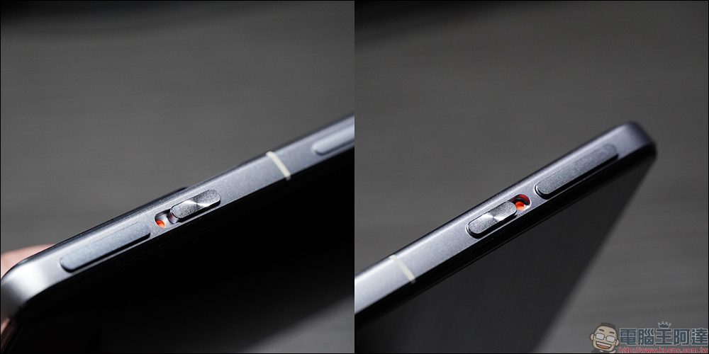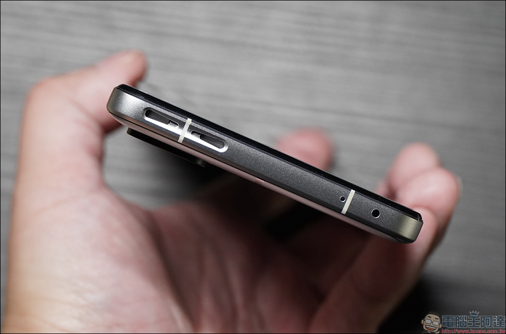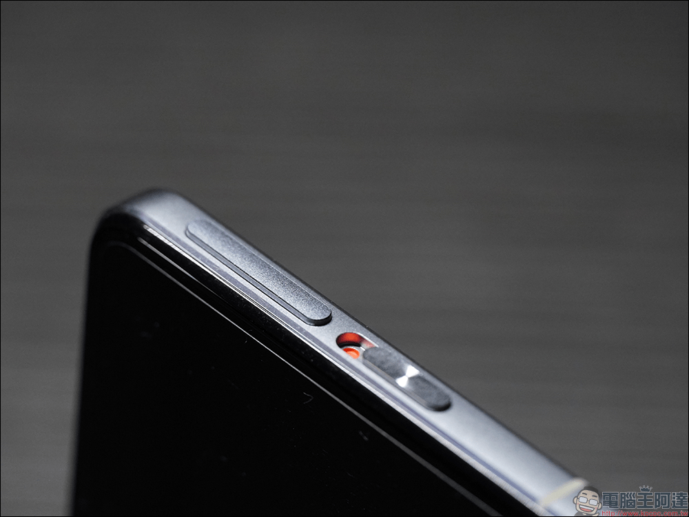在螢幕左方的機身側邊,則設置了 SIM 卡插槽、音量鍵和麥克風收音孔。POCO F4 GT 支援 5G+5G 雙卡雙待,不過 SIM 卡雙面皆為 nanoSIM 卡槽,因此無法透過 microSD 記憶卡擴充儲存容量。