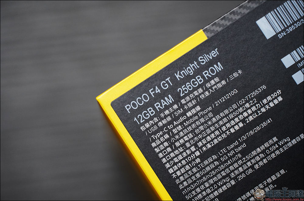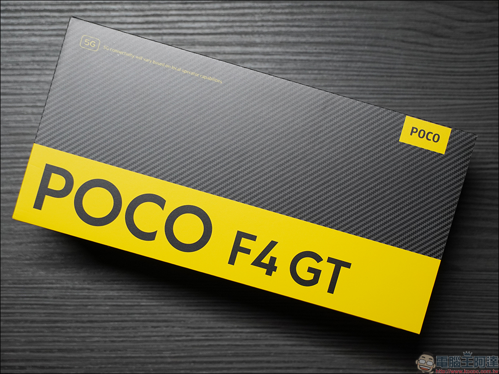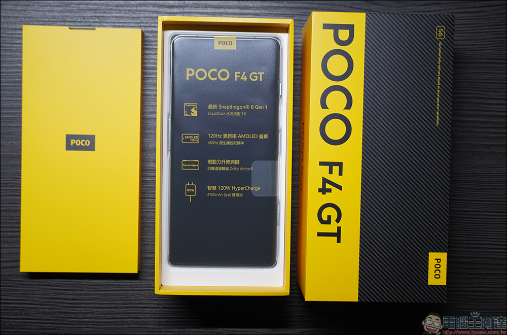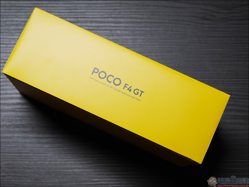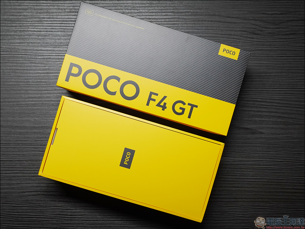 POCO F4 GT 的盒裝設計,採用招牌的黃、黑配色搭配: