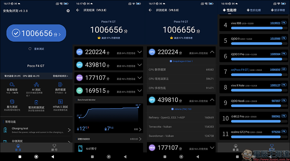 簡單用安兔兔 V9.3.8 進行實測 POCO F4 GT 的性能跑分,輕鬆突破 100 萬的成績: