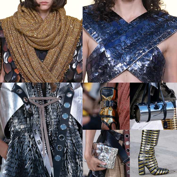 在這場大秀上,除了遊牧風格的層次外,第二個貫穿整場的設計元素便式「金屬光澤」,不管是透過布料本身的緹花刺繡,還是藉由亮片或漆皮的光澤去呈現,對於為來充滿想像的 Nicolas Ghesquière,用金屬的色澤展科幻感的服裝氛圍,同樣極具光澤材質的面料,設計師亦運用在鞋履及包款上。