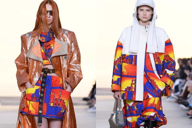 在服裝的面料呈現中,設計師不僅透過金屬光澤展現未來感,大秀場地索爾克生物研究所的獨特外觀,搭配上夕陽西下的橙橘色場景,亦成為服裝上的印花,暖色調的色彩呈現,亦呈現了春季慵懶的氣息。