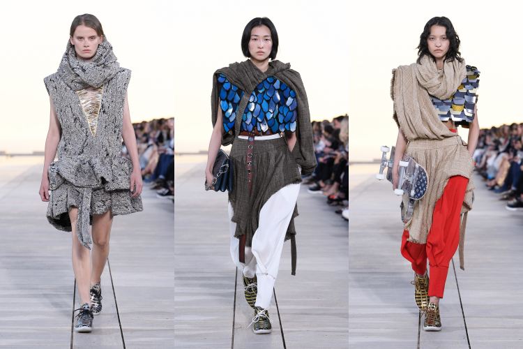 從大秀的舉辦地美國西岸加州做延伸,當地炙熱氣候風情,成了伸展台上游牧風格服裝的靈感起源,從一開場披掛式的刺繡禮服,到後面多套抓皺及層疊的服裝,在充滿民族風情的輪廓下,創意總監 Nicolas Ghesquière 注入了他最愛的未來感,每套服裝都讓模特兒宛如是電影《沙丘》中的演員。