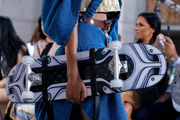 近幾年各個女裝品牌都將搶著將男人味十足的街頭的文化帶到設計中,而 Louis Vuitton 在這次的大秀中,則用了一個超時髦的金屬面滑板來展現街頭感!搭配上一條可背上肩膀上的背帶,這塊滑板不止酷女孩喜歡,連男生都會愛!
