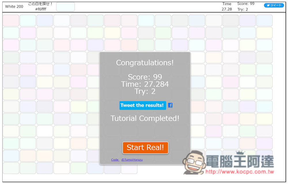 雖然有很多類似的白色,但仔細且專心找,還是可以很快找到正確答案(當然,你對顏色的敏銳度不能太差),像這場我只花 27 秒,嘗試 2 次就找到正確的白色,獲得 99 分(滿分 100 分):