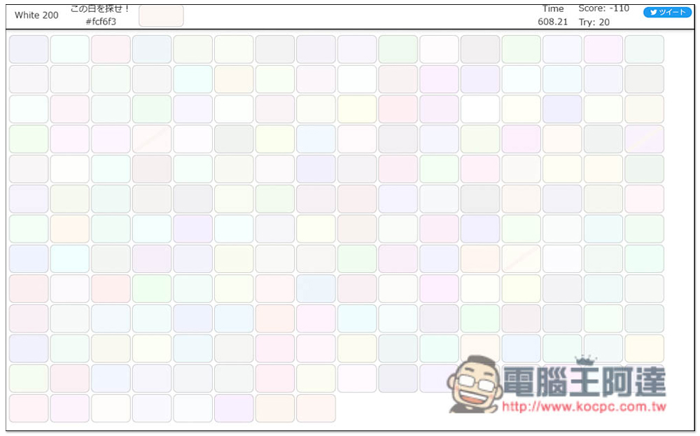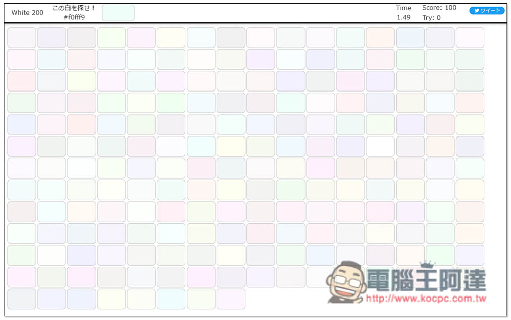 這小遊戲的操作雖然簡單,就點擊題目指定的白色色塊,但每一個色塊顏色都非常接近,因此除了辨識出這色塊是什麼顏色外,還必須判斷顏色的深淺度,對色彩敏銳度很高的人,才能快速找到解答。