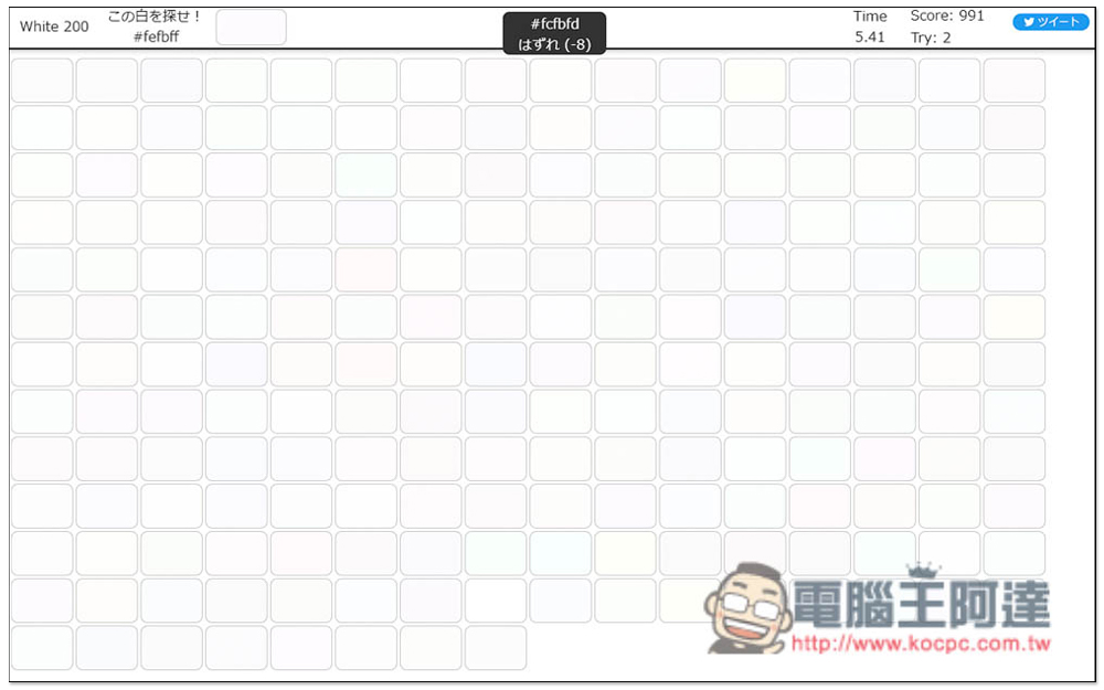 最近在日本 Twitter 中,有一款「White 200」小遊戲相當火熱,轉推數量破萬,不是什麼操作或內容困難的遊戲,而是非常簡單的 "從 200 個白色找出指定白色",也就是說畫面會出現 200 種接著白色的顏色,看你花多長時間、錯多少次才找到答案,考驗你對色彩的敏銳度。