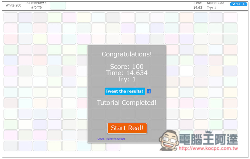 我還成功一次就找到正確的白色,只花 14 秒,滿分 100 分: