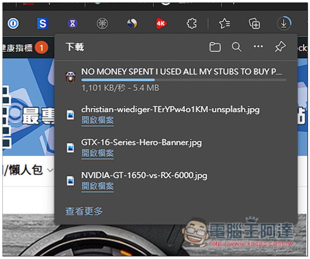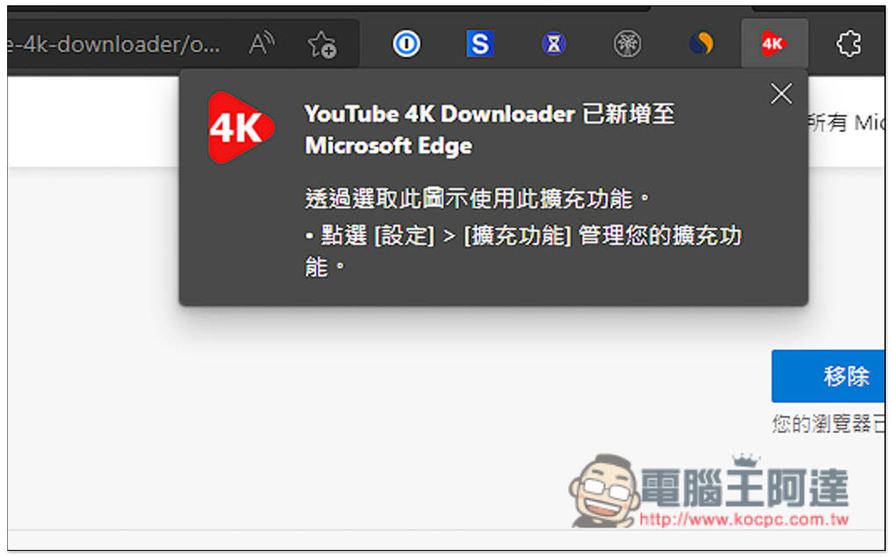 右上角跳出這訊息就代表安裝完成,隨後它的圖示應該會自動隱藏起來,這不用管它,因為下載時不需要這個圖示功能,直接進到 YouTube 影片頁面即可: