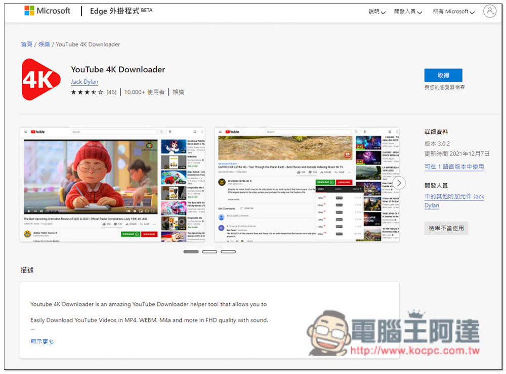 這邊我以 Microsoft Edge 為例,進到 Edge 擴充商店後,點擊右上角 "取得":