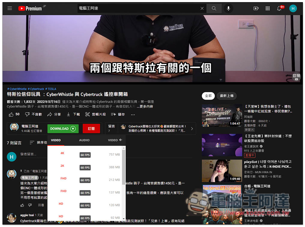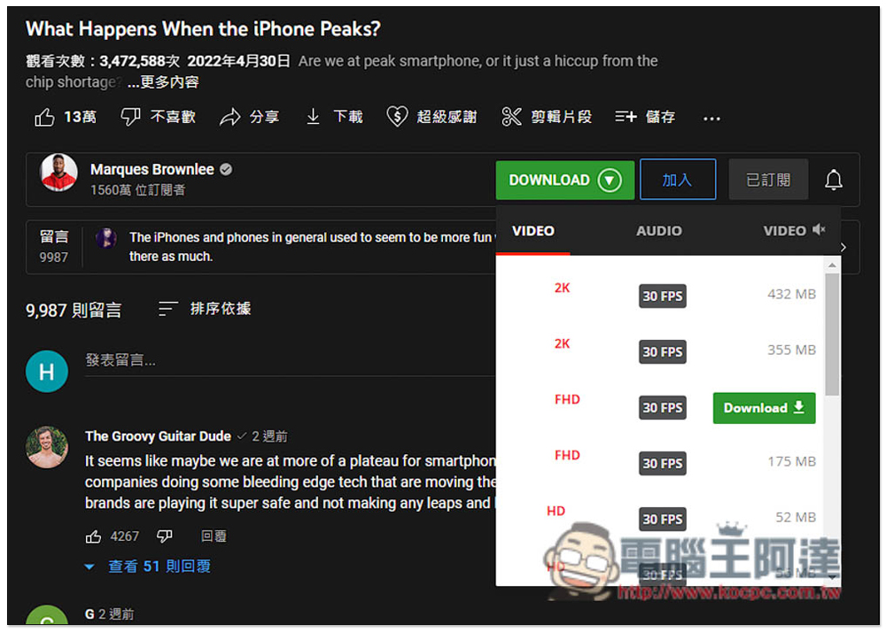 就會跳出下載選項,影片部分會告訴你解析度、FPS 多少,以及檔案多大,按 Download 就會開始下載。比較奇怪是,有一些解析度有兩個下載選項,如:FHD 60FPS 就有兩個,HD 60FPS 也是,但檔案大小不一樣,因此就看你要下載哪一個,建議可以選檔案大一點的,通常畫質比較好。猜測應該是格式不同,MP4 與 WEBM,通常 WEBM 檔案比較小: