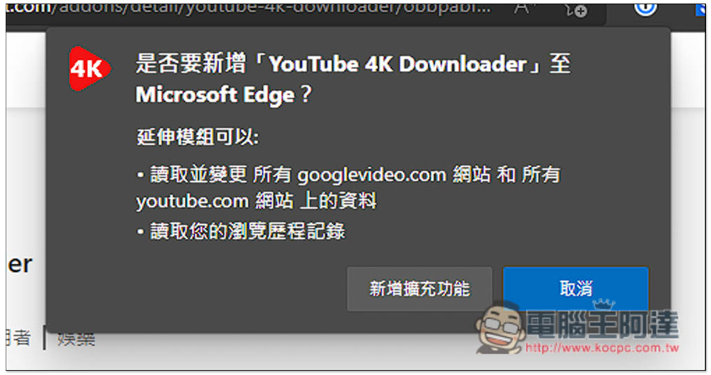 上方會跳出這訊息,點擊 "新增擴充功能" 進行安裝: