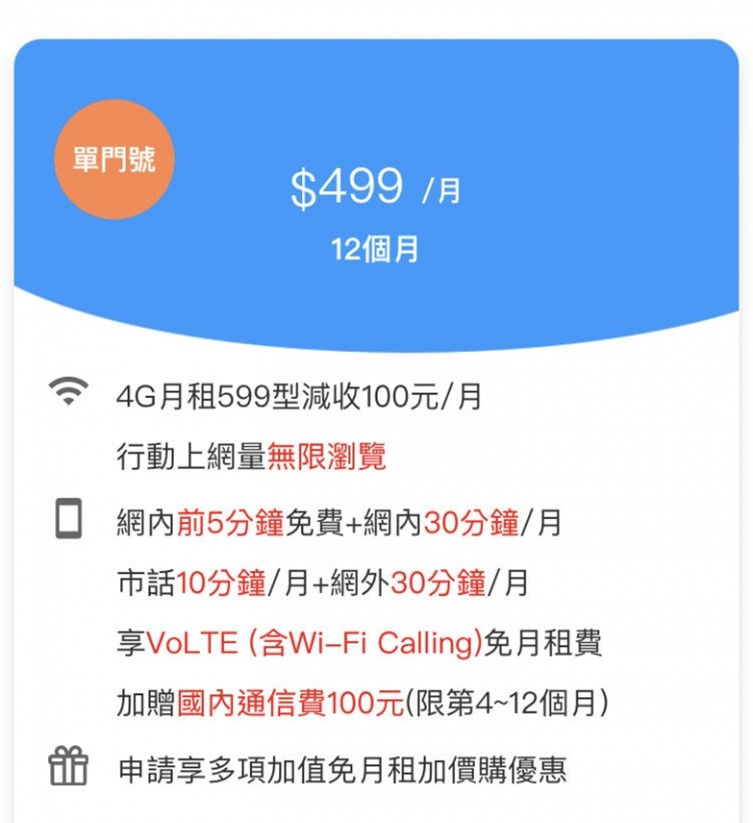 網友點其申辦連結後,顯示該方案為中華電信499(12)不限速吃到飽方案,僅限攜碼用戶申請,除合約期間4G不限速上網吃到飽外,網內前5分鐘+30分鐘免費,網外免費30分鐘+市話免費10分鐘,第4~12個月每月加送$100國內語音通話費,並享合約期間VoLTE免月租費優惠。
