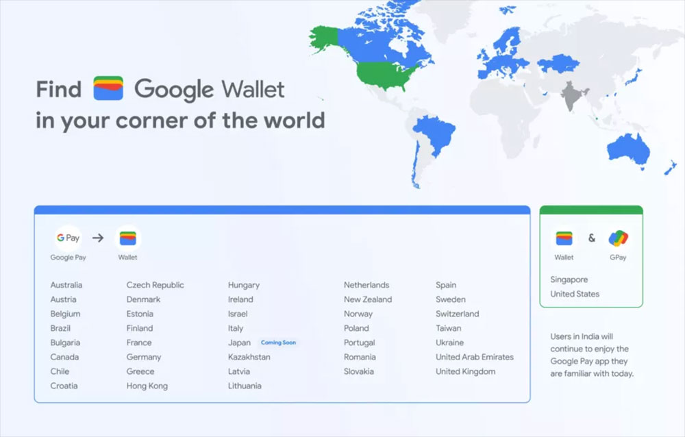 但在美國和新加坡,Google 錢包將與 GPay 並存。錢包將是未來 Android 手機上預載的預設項目,Google 提供 GPay 作為端對端支付的替代方案。因此,如果美國和新加坡的用戶不需要進行端對端支付的話,則可以使用錢包應用 。