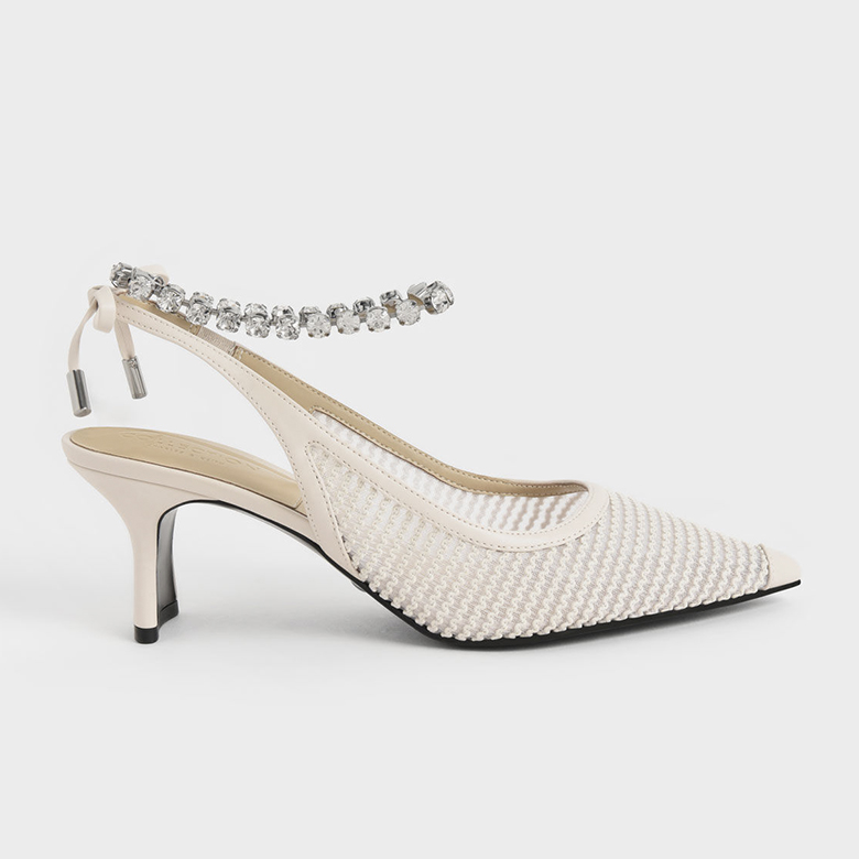 讓無數女孩心生嚮往的芭蕾舞女伶綁帶設計,結合能修飾腿型襯托氣場的高跟鞋,繞踝綁帶不僅修飾著雙腳讓腿長無限延伸,典雅的石灰白搭配也剛好符合修飾膚色的特性。除了在婚宴正式場合上穿著,未來也能用來搭配九分牛仔煙管褲,把婚禮上的喜悅延伸到日常生活中。(售價:NT$ 2,590)