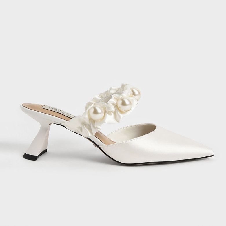 雪亮的緞面尖頭穆勒鞋點綴時下最流行的抽皺設計與珍珠裝飾,高度適中的美麗貓跟不僅能延伸腿部比例,也方便配合換裝時的穿脫需求。讓你在敬酒時能自由穿梭在婚宴現場,非常適合選搭中長紗裙或是有計劃在After Party俏麗亮相的你,不需過度花費心思就能展現出女人極致的美。(售價:NT$ 2,590)