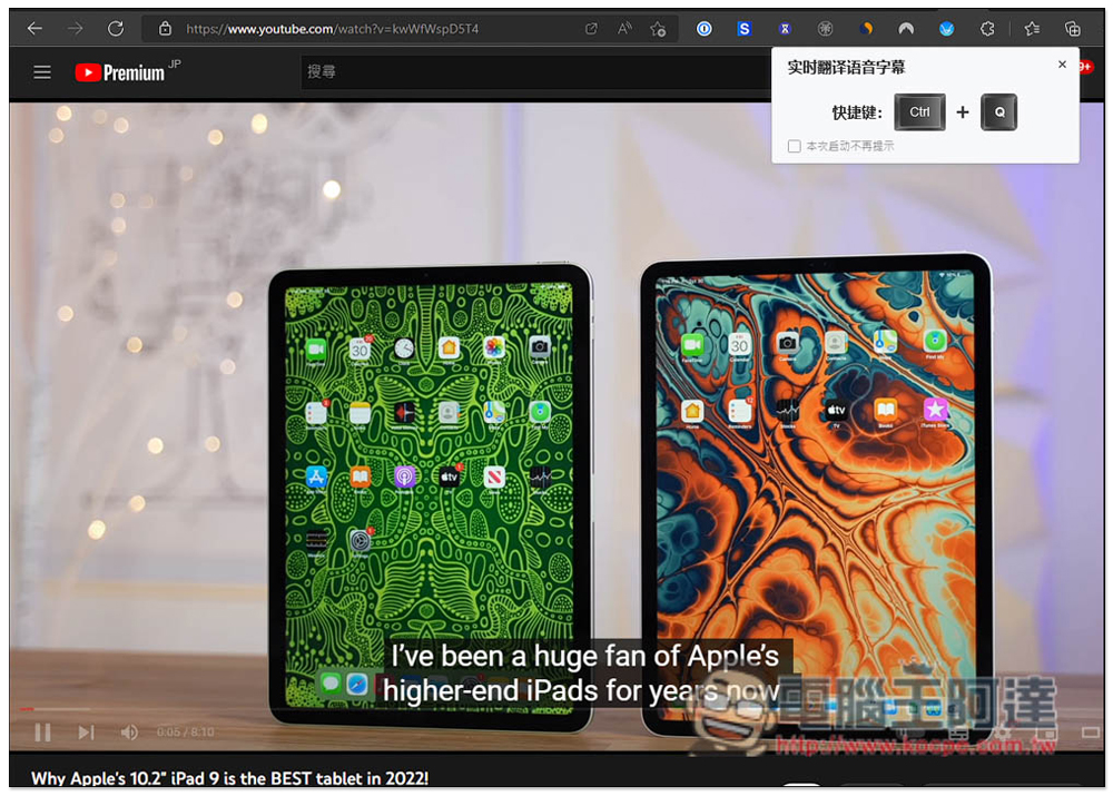 播放影片時,右上角也會跳出提示,如要啟用實時翻譯語音字幕就按 Ctrl+Q: