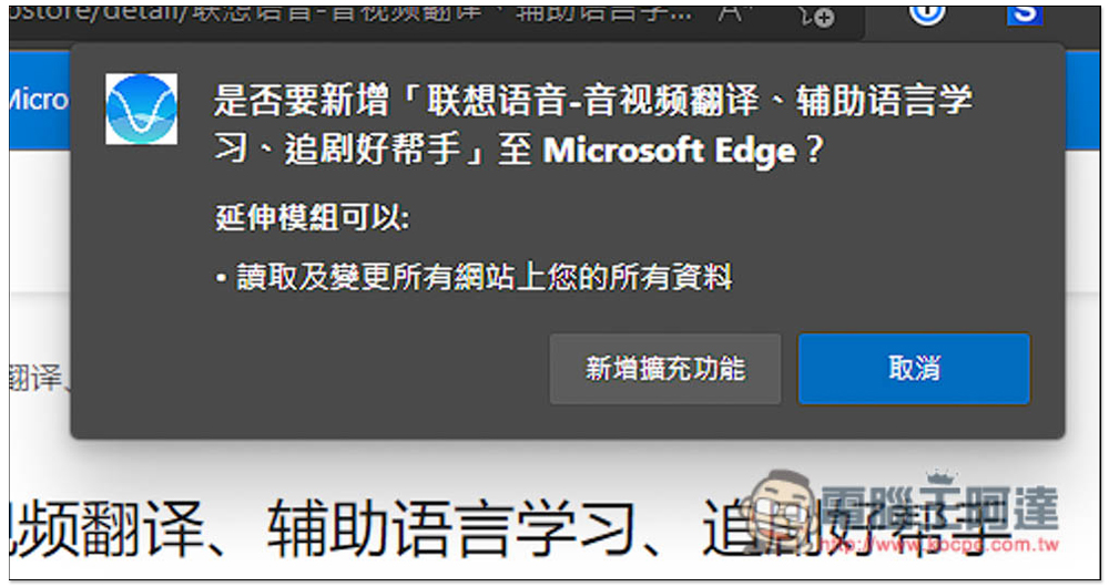 上方會跳出這訊息,點擊 '新增擴充功能" 進行安裝: