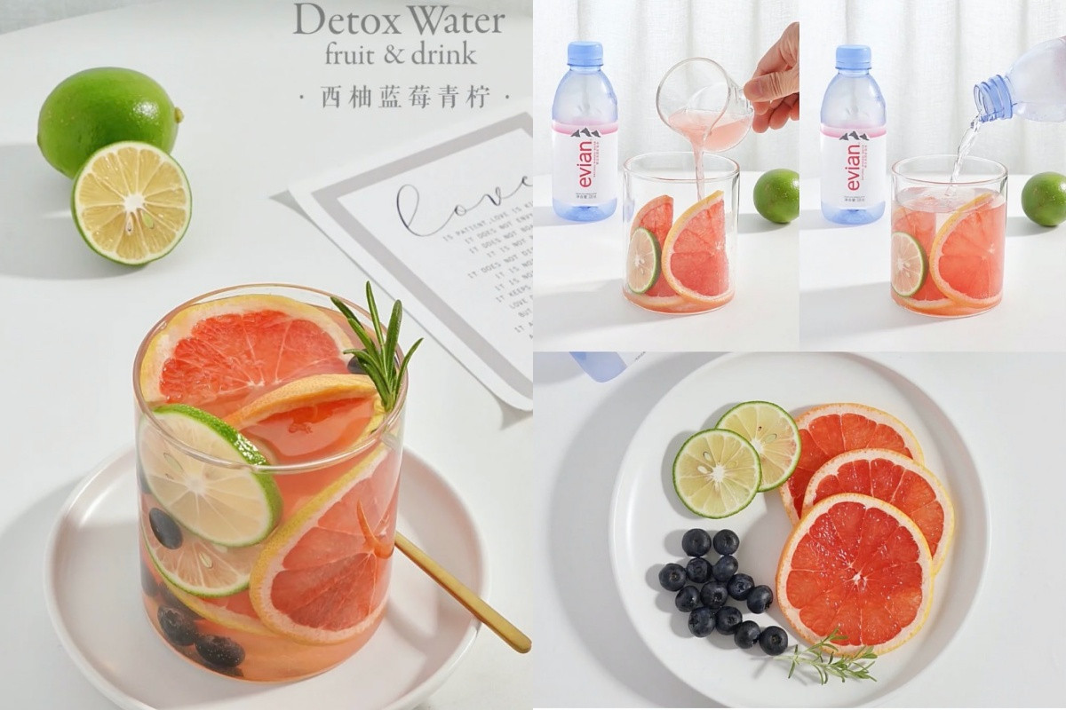 葡萄柚放進氣泡水顏值真的太仙!同樣也是準備好氣泡水一瓶,再把葡萄柚、檸檬切片放入杯中,還有藍莓10~12顆,最後點綴上迷迭香就完成了,步驟真的無敵簡單,而且藍莓和葡萄柚這兩種水果本身熱量都很低,還具有保護心血管、抗氧化特性,營養價值極高。