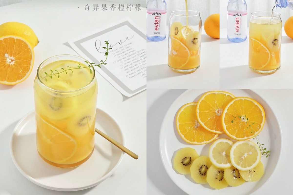 首先準備好氣泡水一瓶,再將柳橙、黃金奇異果、檸檬分別切片,放入玻璃杯中並倒入氣泡水,最後再放上百里香葉點綴就大功告成啦~這款視覺與沁涼感兼具的氣泡飲,能有助消化、穩定情緒、補充人體所需礦物質。