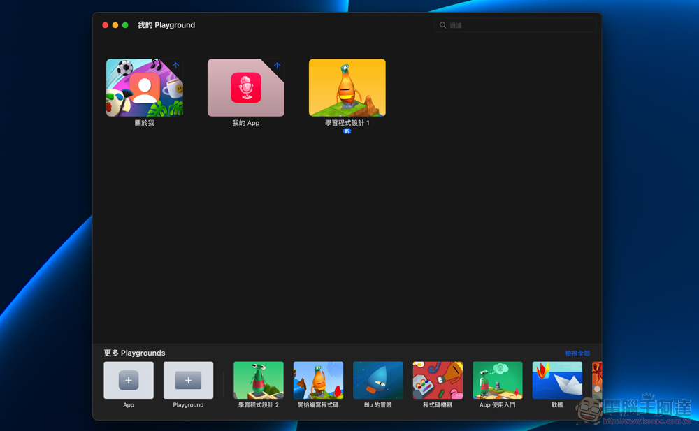 最新 4.1 版的 Swift Playgrounds 與 iPadOS 版本的非常相似,都可以直接在首頁啟動下載過的 App 學習資源,也可以直接從左下角啟動新的 App 或 Playground: