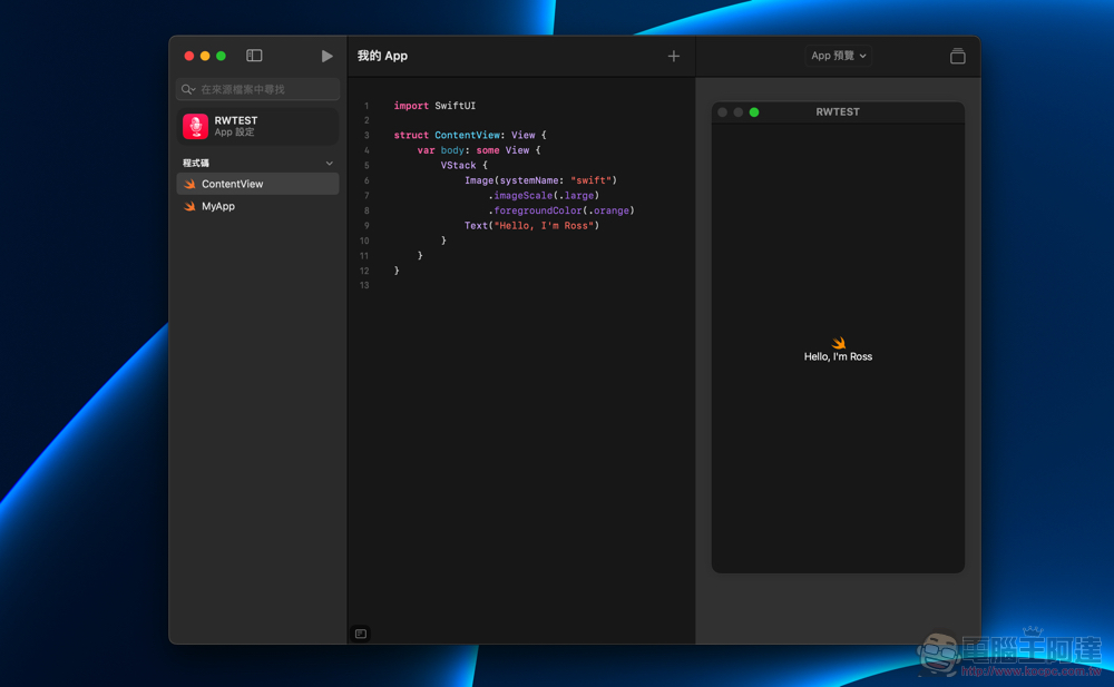開啟 App 範本後,可以大膽的更改程式碼,並且從右方的 App 預覽視窗馬上看到成果 - 這裡我們把學習程式經典範例的「Hello World」改成了自己的名字: