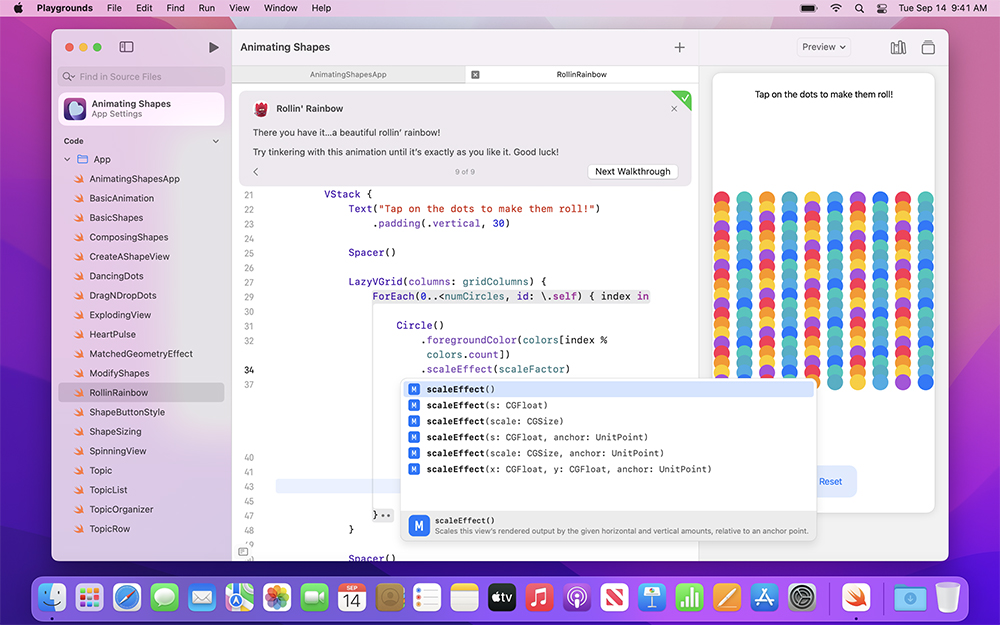 甚至你想要打包成 macOS app 分享給朋友,或是登入帳號加入 App Store Connect,成為蘋果開發者的一員。都是可以從這個 Playground 築夢踏實辦到的事 - 真的是如玩樂般摸索,就瞬間上手以往可能得要撞牆好一陣子的學習過程: