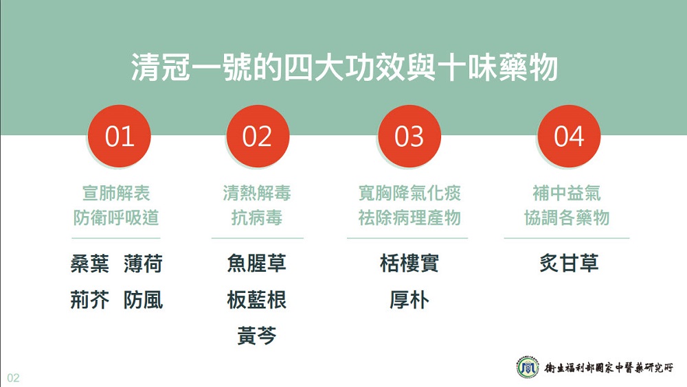 清冠一號由桑葉、薄荷、板藍根、炙甘草等十味藥物組成,具備宣肺解表、清熱解毒、降氣化痰、補中益氣等四大功效,包含輕度感染者、中度感染者可使用標準用藥療程。