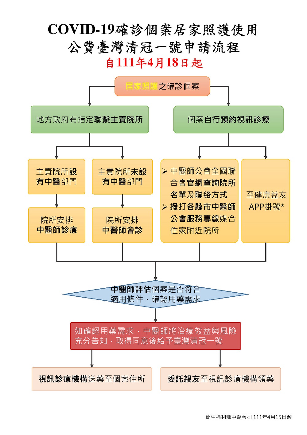 按照衛福部公告的COVID-19確診個案居家照護使用公費「臺灣清冠一號」申請流程,確診個案經診療後再由中醫師診斷開立處方後使用,並可委託親友至通訊診療之中醫院所領藥,或由通訊診療之中醫院所送藥至個案住所。