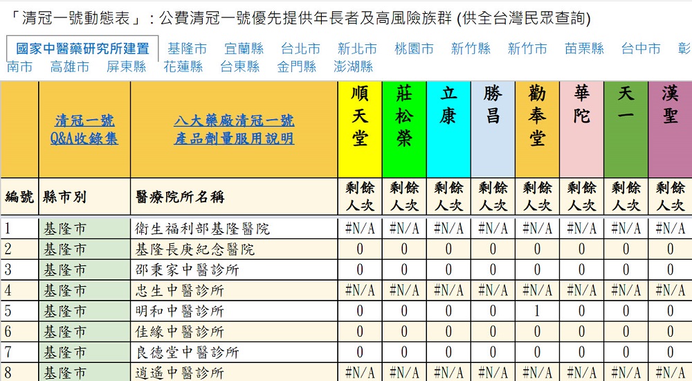 「公費清冠一號動態查詢表」上線 可查詢全國八大藥廠清冠一號院所庫存